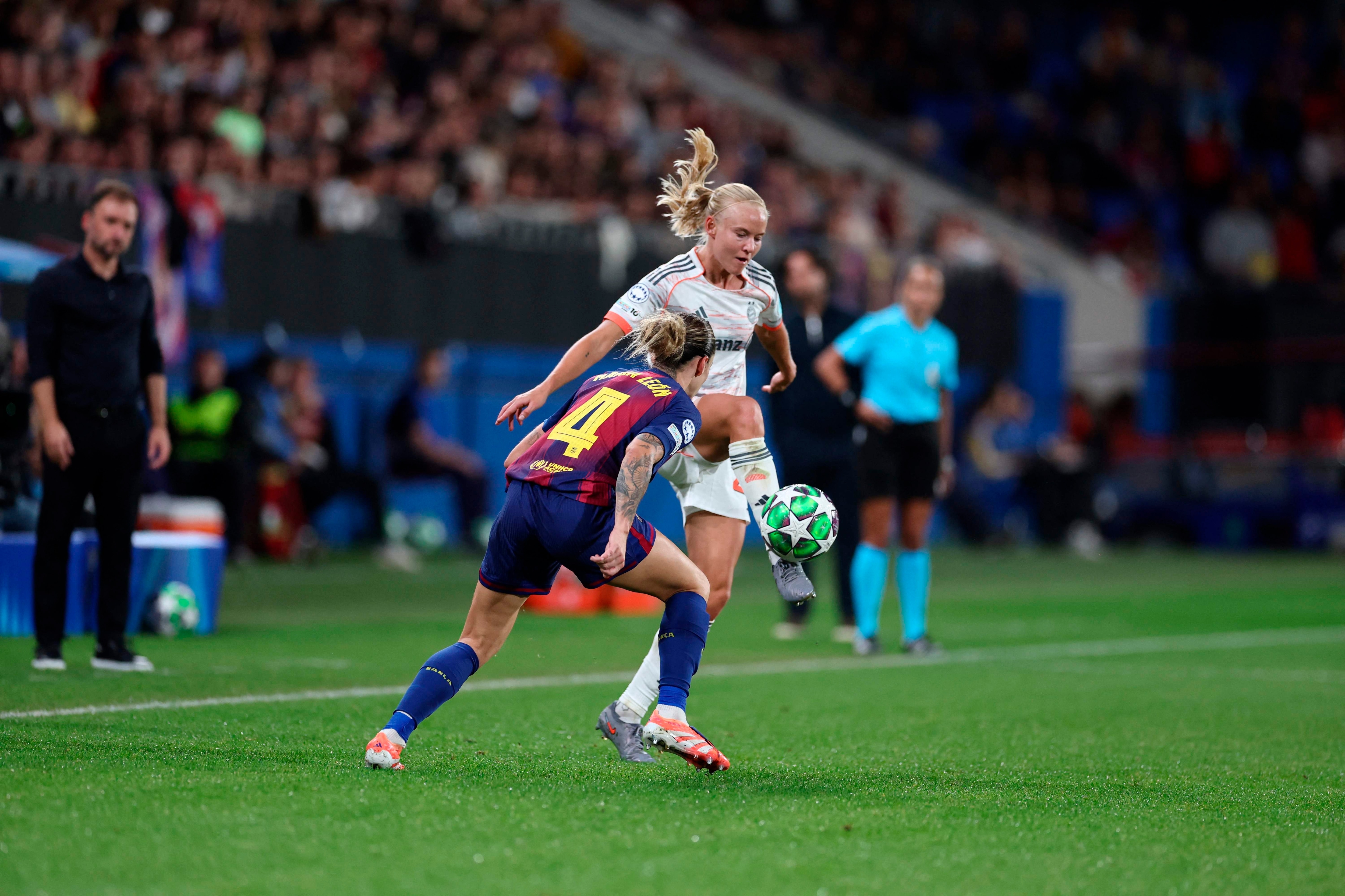 Barcelonas Spanish defender #04 Maria Pilar Leon fights for the ball with Bayern Munichs Danish forward #21 Pernille Harder during the Womens Champions League, league phase day 1 football match between FC Barcelona and Bayern Munich at Johan Cruyff Stadium in Barcelona on October 7, 2025. (Photo by Josep LAGO / AFP) (Foto: © Josep Lago, AFP/Ritzau Scanpix)