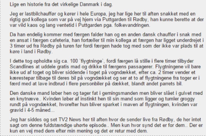 Historien gik på, at en flygtning angiveligt skulle have sparket en gravid kvinde i maven på Rødby-Puttgarden-færgen.
