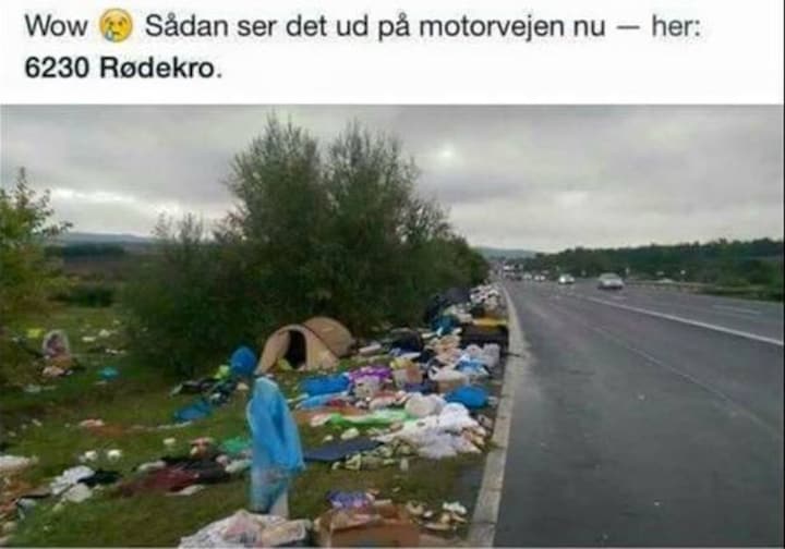 "Wow. Sådan ser der ud på motorvejen nu - 6230 Rødekro”, skrev en bruger på Facebook over et billede, som viste et område fyldt med skrald - angiveligt efterladt af flygtninge på deres rejse gennem Rødekro i Sønderjylland.