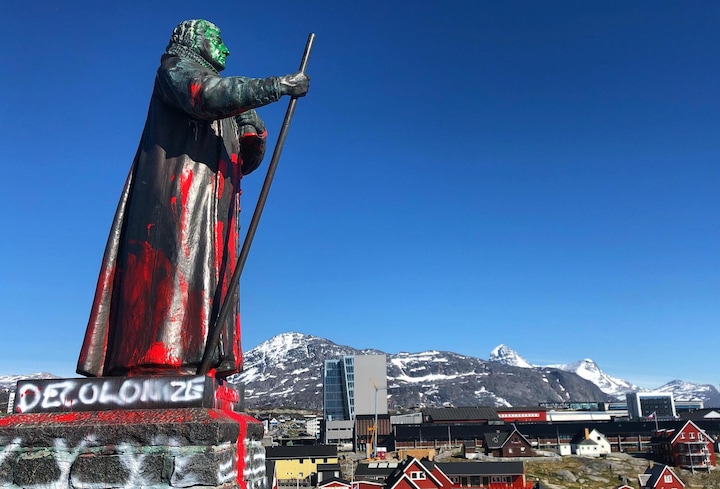 Men natten til i går blev statuen af Hans Egede, den dansk-norske missionær, overhældt med rød maling. Og på foden af statuen var malet teksten 'Decolonize' - altså et opråb om af afkolonisere Grønland. På Grønlands nationaldag.