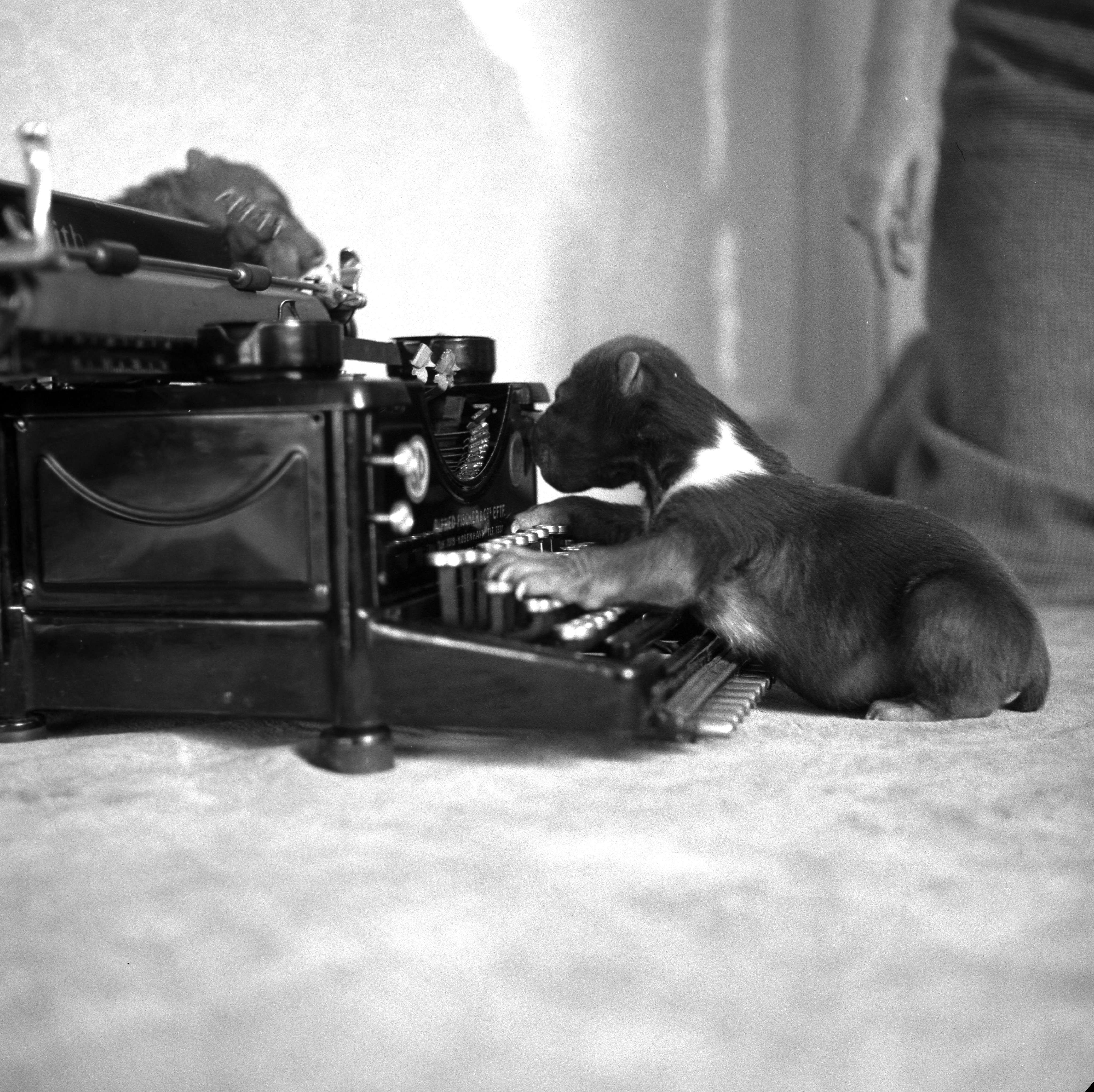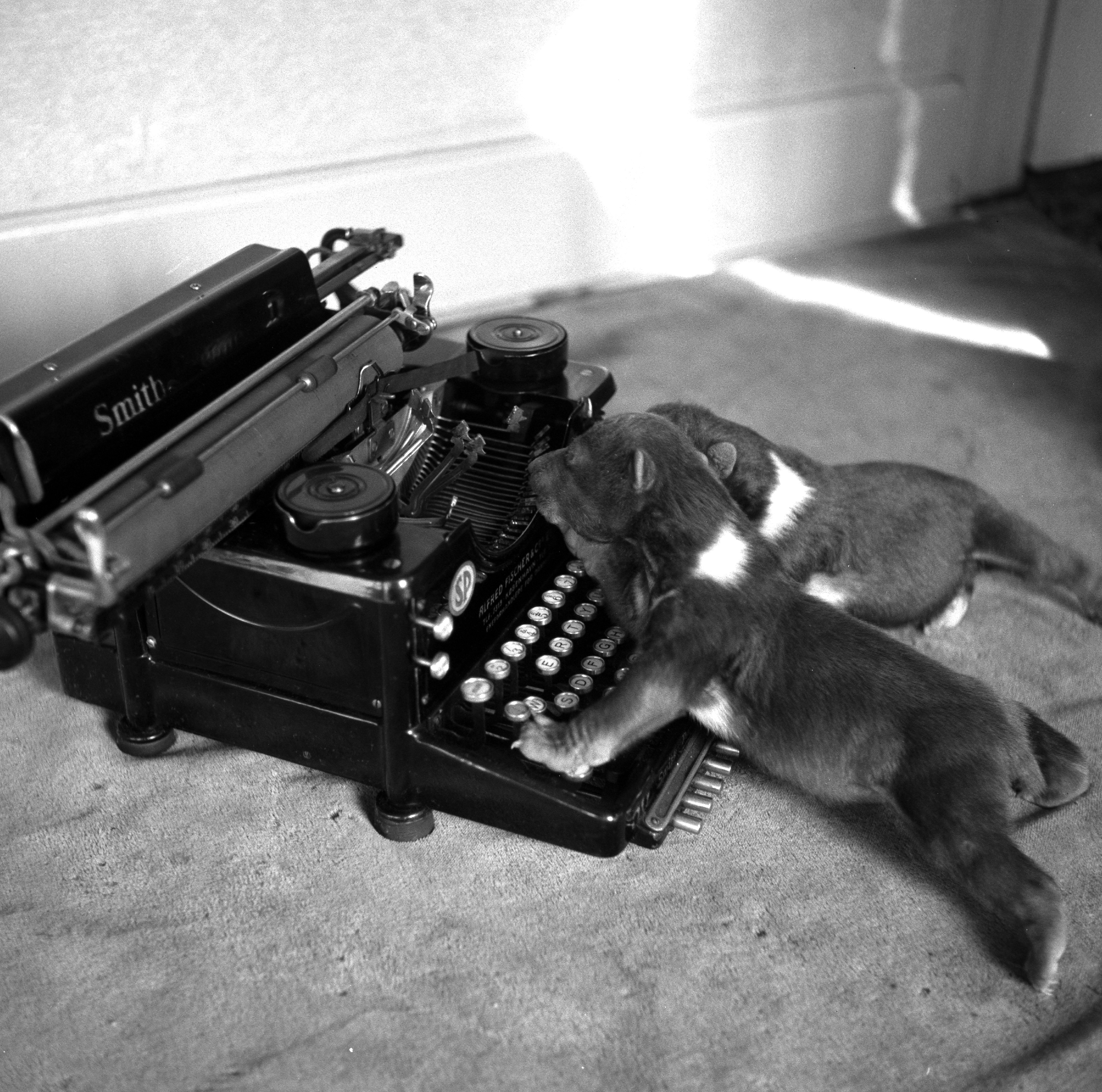 Nu kommer der to billeder af hundehvalpe og en skrivemaskine
