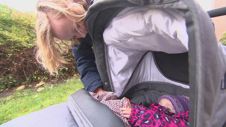 Hun bøjer sig ned og lægger dynen bedre om sin datter Emilie på halvandet år, der sidder i barnevognen, som Marie Mygind Damgaard skubber foran sig. Emilie kom også til verden ved ægdonation.
