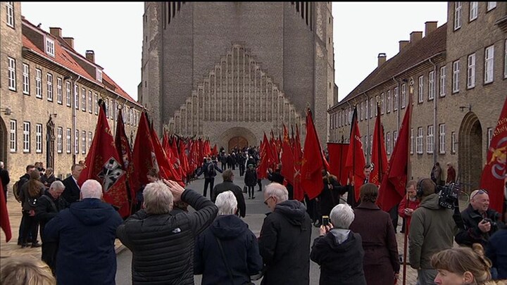 Området omkring kirken i det ikoniske tidligere arbejderkvarter Bispebjerg er ligeledes fyldt med folk, der er mødt op for at sige et endeligt farvel med Danmarks tidligere statsminister Anker Jørgensen, som også er kendt som "den sidste arbejder" på posten.