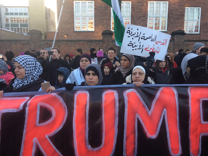 Under de mange flag med palæstinensiske farver er vreden vendt mod USA's præsident Donald Trump, hvis regering har valgt at anerkende Jerusalem som Israels hovedstad.