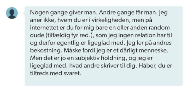 I DR2-dokumentaren tager vært Michael Jeppesen kontakt til den unge mand, der har skrevet: Ingen hage – ingen mening. Manden skriver tilbage med det her svar: