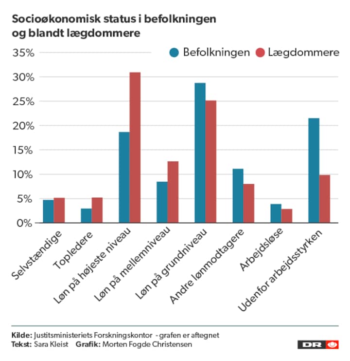 Men ser man på de lægdommere, der sidder på dommerbænken, tegner der sig et andet billede af lægdommerne end det brede udsnit af danskerne.