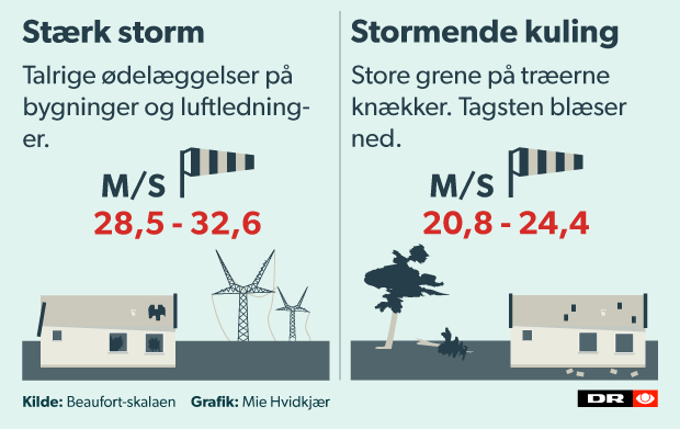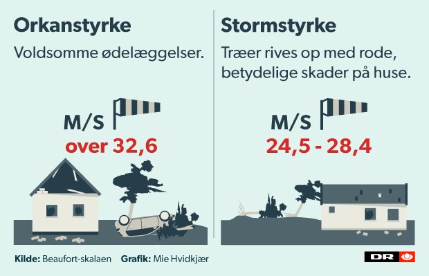 DMI forventer storm med vindstød fra 25-28 meter i sekundet op til orkanstyrke 33-36 meter i sekundet.
