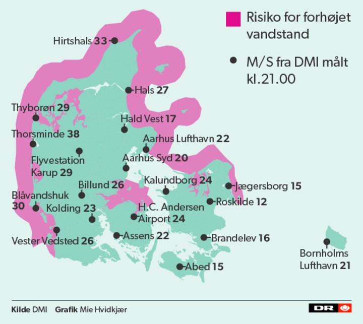 Fra midnat og de efterfølgende timer vil vinden skifte til at komme fra nordvest, og det får stor indflydelse på vandstanden, som vil være støt stigende flere steder.