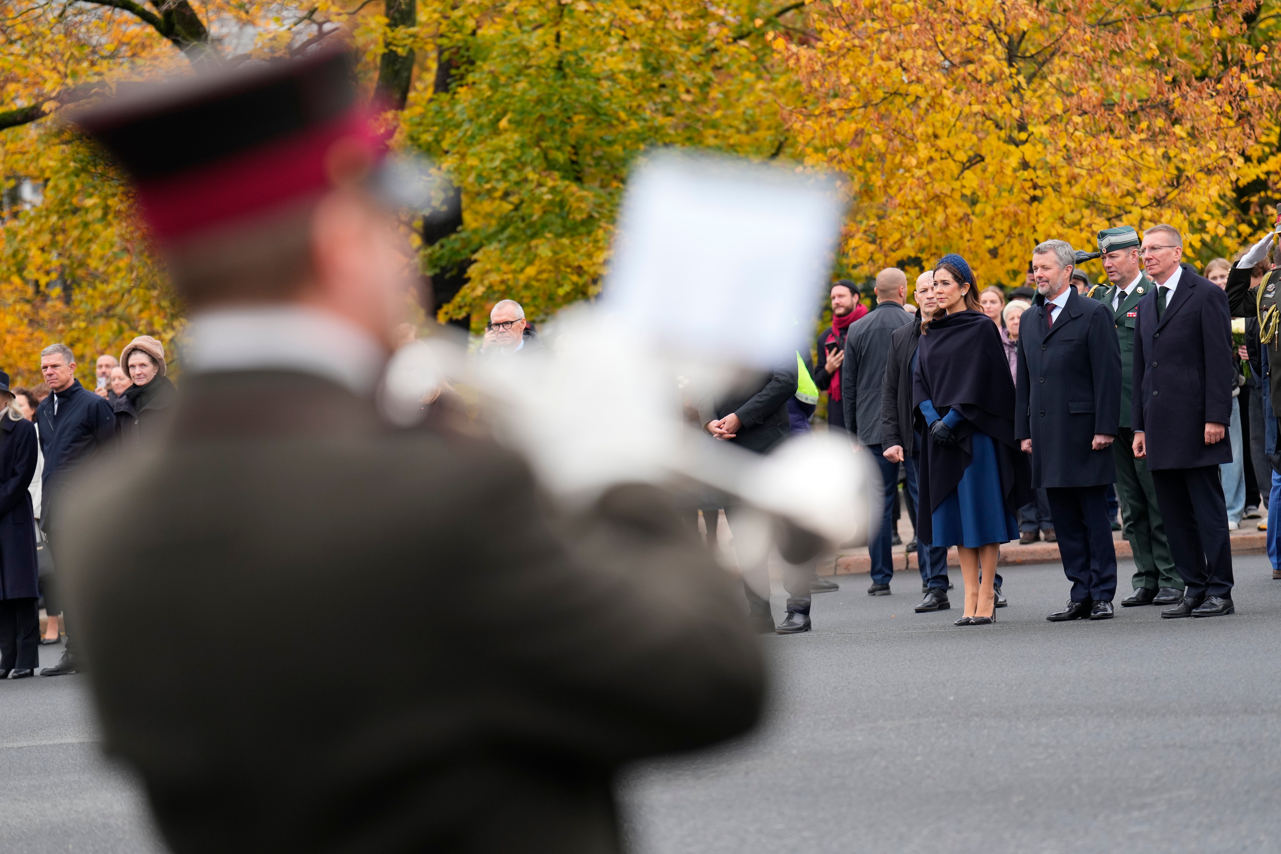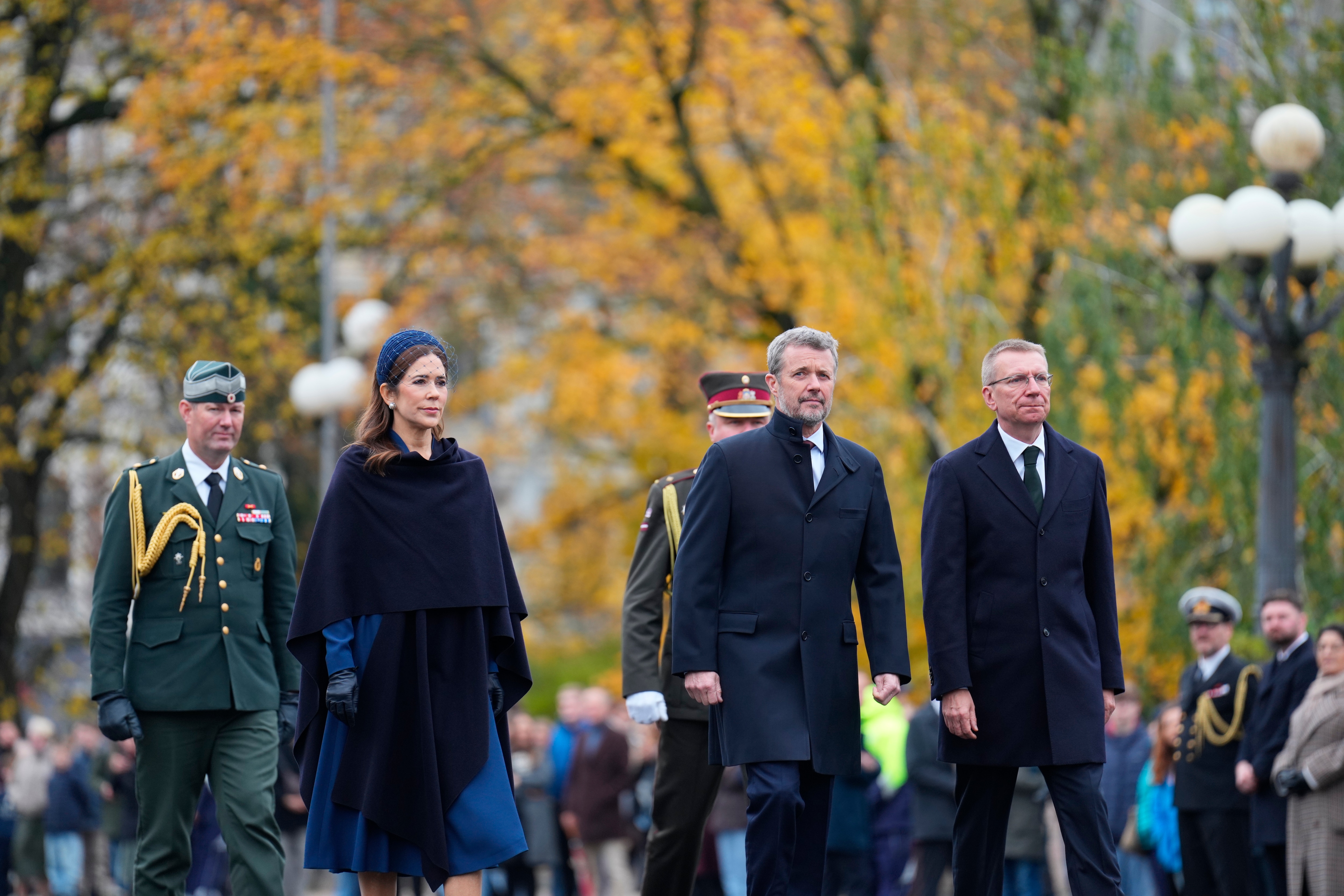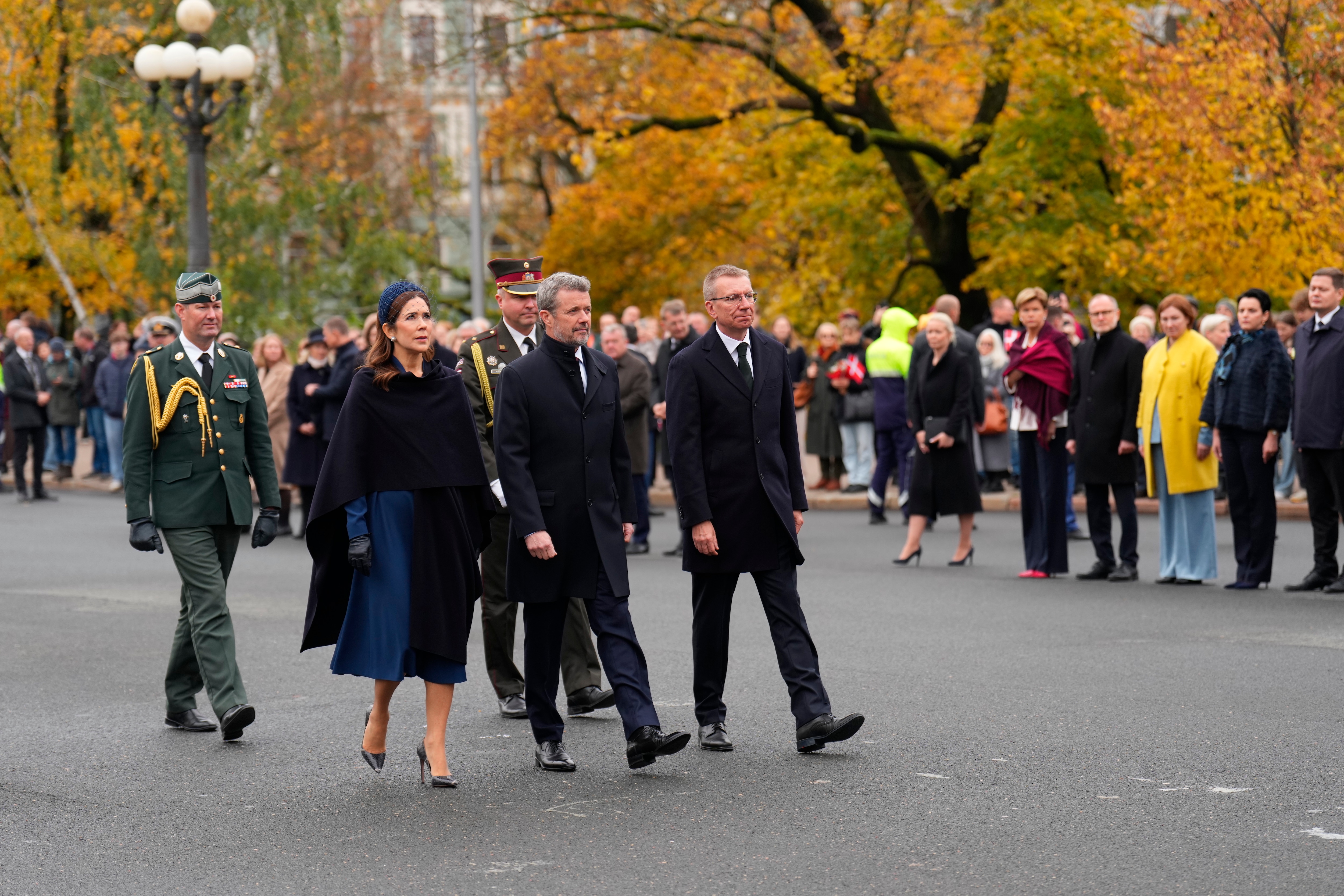 Kong Frederik og dronning Mar lægger blomster ved Frihedsmonumentet Br?v?bas piemineklis i Riga tirsdag den 28. oktober 2025. Rejst i 1935 til minde om uafhængighedskrigen, står monumentet i dag som symbol på Letlands frihed. Kongeparret er på statsbesøg til Letland 28.-29. oktober 2025. Besøget har især fokus på internationalt militært samarbejde, blandt andet med besøg hos udstationerede danske soldater. Også kulturen er i fokus ved besøg på det lettiske Kulturakademi og Rigas Art Nouveau-distrikt. (Foto: © Ida Marie Odgaard, Ritzau Scanpix)