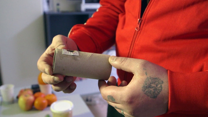 Med sine tatoverede hænder holder Steven Amzic om et gråt paprør. Det stammer fra en toiletrulle, men han har boret et ekstra mindre hul i og kan nu bruge røret til et helt andet formål.