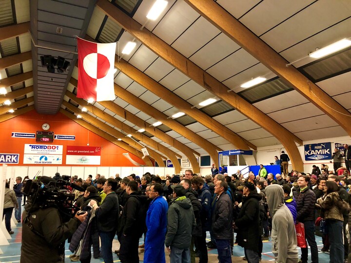 Da klokken nærmer sig 9 lokal tid er Godthåbshallen proppet med mennesker, som har dannet køer ned mod valgboksene. Flere toppolitikerne er også dukket op på.