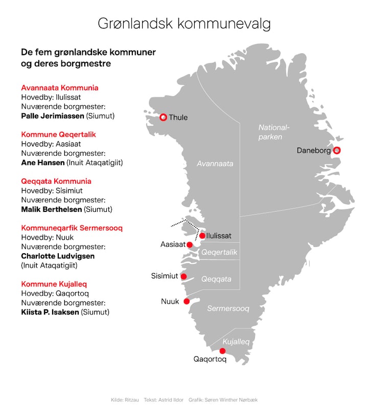 Grønland har fem kommuner, hvor der skal udpeges nye kommunalbestyrelser.