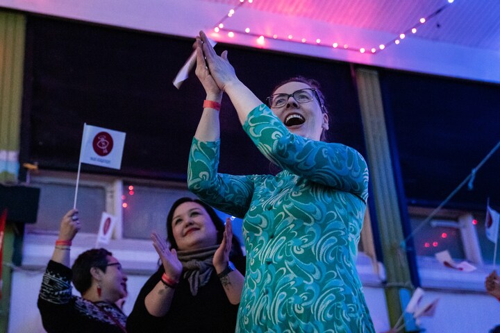 Endnu resultat fra kommunalvalget løber over skærmen. Der bliver jublet i Kulturhuset i Nuuk.
