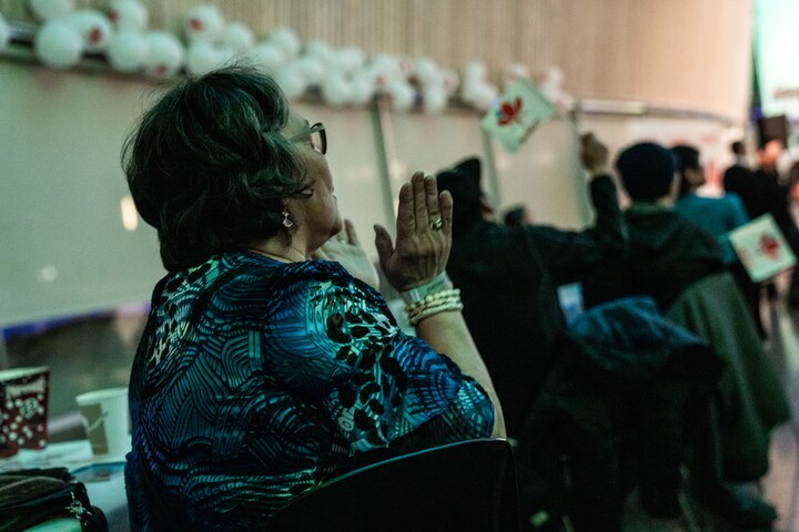 Ane Marie Kristiansen og Ane Johanne rejser sig sammen med det meste af salen.