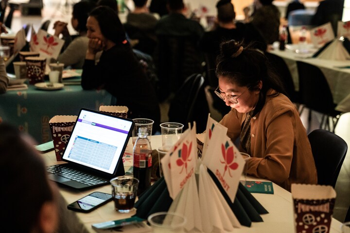Der er stilhed i det højloftede lokale. Menneskerne ved de opstillede seksmandsborde lytter koncentrerede til de valgresultater, som fra en storskærm bliver læst op af KNR's studievært.