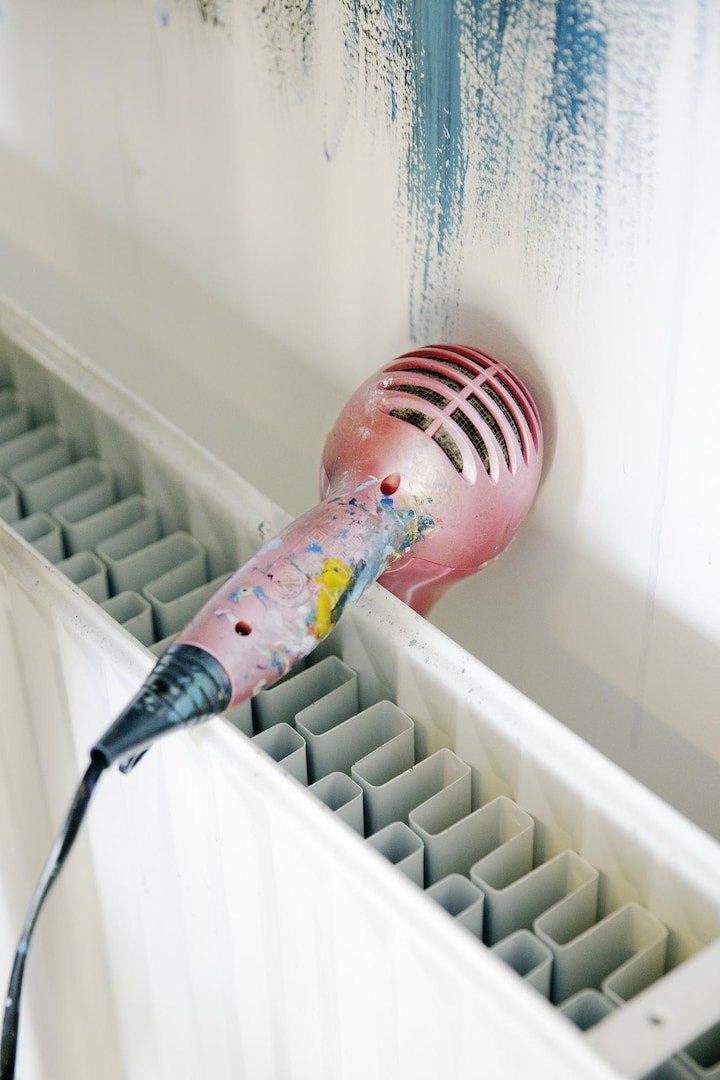 Jeg kunne slet ikke forestille mig at skulle male derhjemme hver dag. Der ville være en masse ting der forstyrrede mig. Opvask. Vasketøj. Og så ville jeg tænke alt for meget over, om jeg nu spildte på gulvet eller tværede møblerne ind i maling. Her kan jeg tørre hænder af i alt.