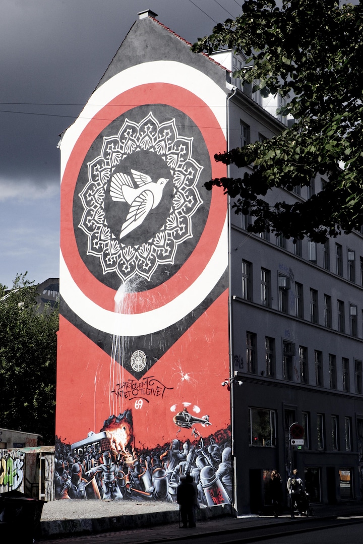 Kunstneren Shepard Fairey blev i 2011 inviteret til at lave et motiv på den gavl, der stod tilbage, efter at Ungdomshuset blev fjernet. Han malede en fredsdue med ordet peace neden under, og det indledte endnu en konflikt på Jagtvej 69.