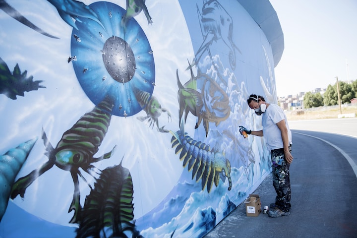 Gadekunstneren Ulrik Schiødt fik tildelt en kæmpe mur i 1999, 170 meter lang og mindst 3 meter høj. Dette var et perfekt lærred til at vise hele verdens udviklingshistorie med et megastort vægmaleri.