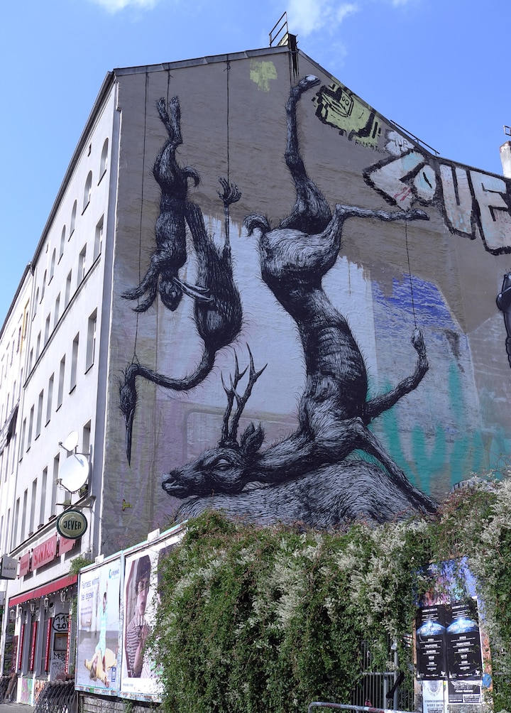 Roa har ikke kun valgt gadekunstens maskot rotten, men en bred vifte af gnavere, som man kan se boltre sig på gavlen.