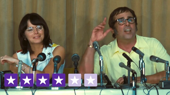 Som hendes komiske modstykke er Steve Carrell ligeså fantastisk som Bobby Riggs, der ikke bare er gjort til en hørmende mandschauvinist, men til en naiv drengerøv og showman, der ser en mulighed for at score kassen ved en tenniskønskamp.