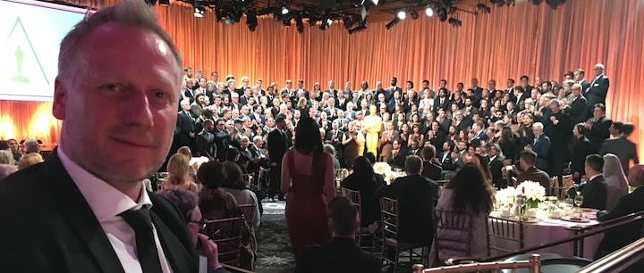 - En af de mest surrealistiske opgaver var den traditionsrige Oscar-frokost. Det var ligesom at være med i en Hollywood-film selv. Frokosten foregik i en stor balsal på Beverly Hotel, og der var både store stjerner, sminkører og os fra lille Danmark. Så går man rundt og mingler, laver lidt presse, og bagefter er der frokost uden pressen - kun for de nominerede og de såkaldte 100 guvernører fra Akademiet. Til sidst bliver alle nominerede kaldt op på scenen en efter en, og så bliver der taget klassefoto.