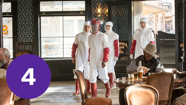 Stemningen er pisket op med billeder af robotgribbe, blodige cowboyhatte og patosfyldte one-liners som “kaos tager kontrollen”.