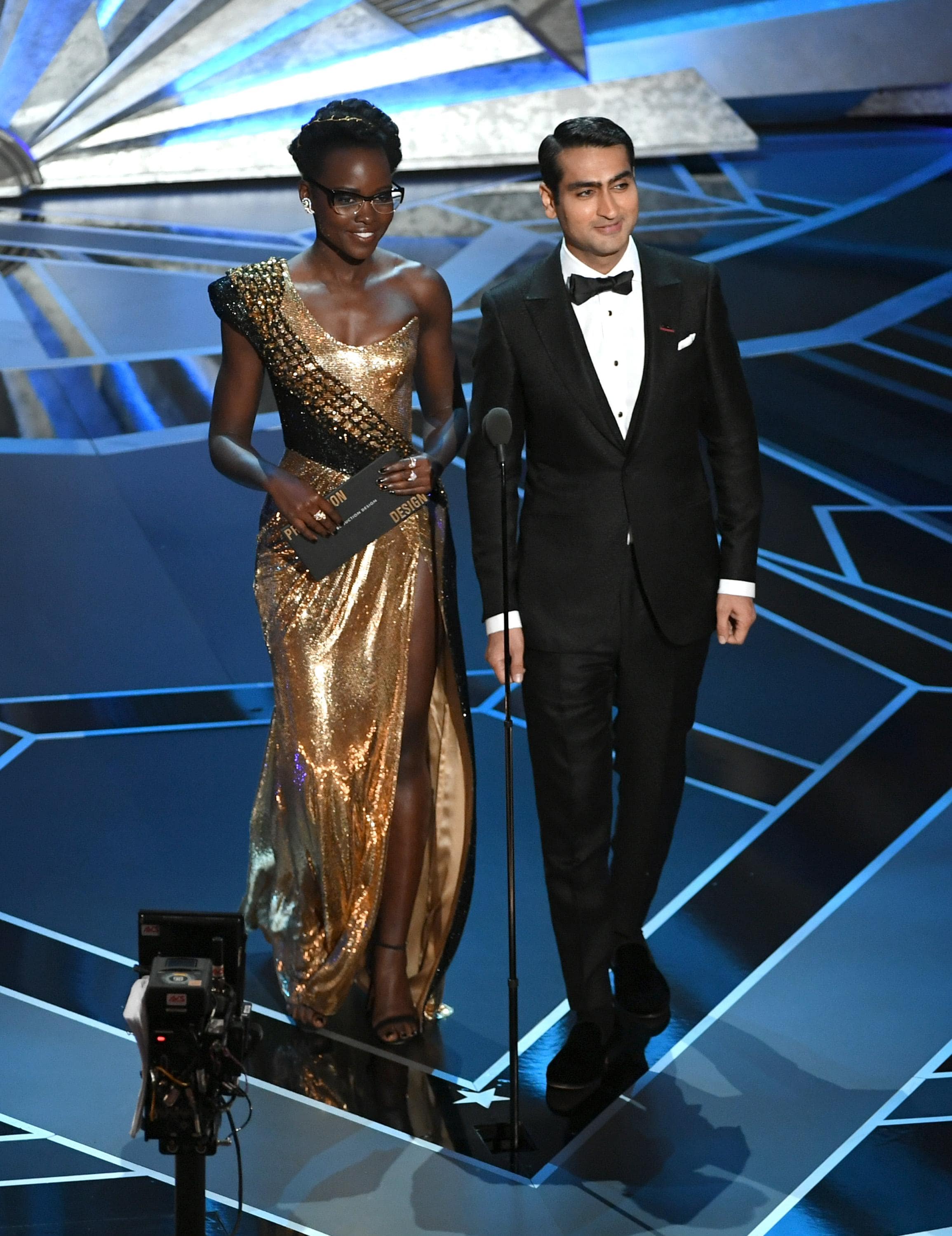 'Vi er to skuespillere, som folk i Hollywood ikke kan udtale navnene på,' lød det fra skuespillerne Lupita Nyong'o (tv) og Kumail Nanjiani (th), som gik på scenen sammen for at præsentere en Oscar-kategori. Deres tale bød på følgende budskab til alle, der drømmer om succes: 'Keep going!' (Foto: © Kevin Winter, 2018 Getty Images)