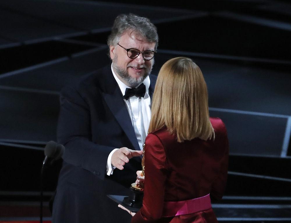 En rørt Guillermo del Toro modtog Oscaren for 'bedste instruktør' af skuespiller Emma Stone. han fik prisen for filmen 'The Shape of Water', der også vandt Oscar-statuetten for årets film. (Foto: © Lucas Jackson, Scanpix)
