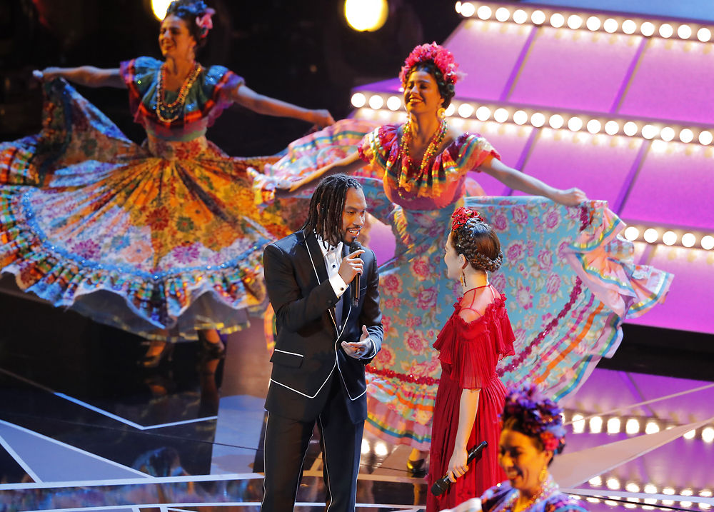 Smæk på farver og stemning, da Miguel og Natalia LaFourcade optrådte med 'Remember Me (Dúo)' fra animationsfilmen 'Coco'. (Foto: © Lucas Jackson, Scanpix)