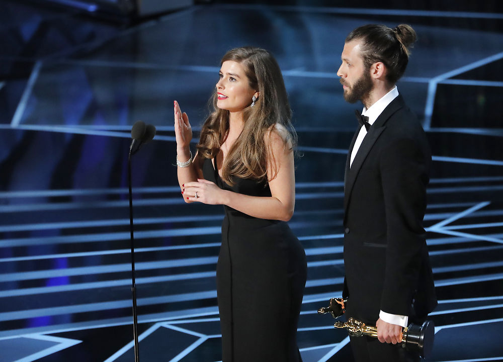 Skuespiller Rachel Shenton fra kortfilmen 'The Silent Child' modtog sammen med filmens instruktør Chris Overton en statuette for bedste kortfilm. Shenton havde lovet filmens 6-årige hovedrolleindehaver Maisie Sly, som er døv, at hun ville tegnsprogstolke sin tale. Hun holdt sit løfte på trods af sine rystende hænder. (Foto: © Lucas Jackson, Scanpix)