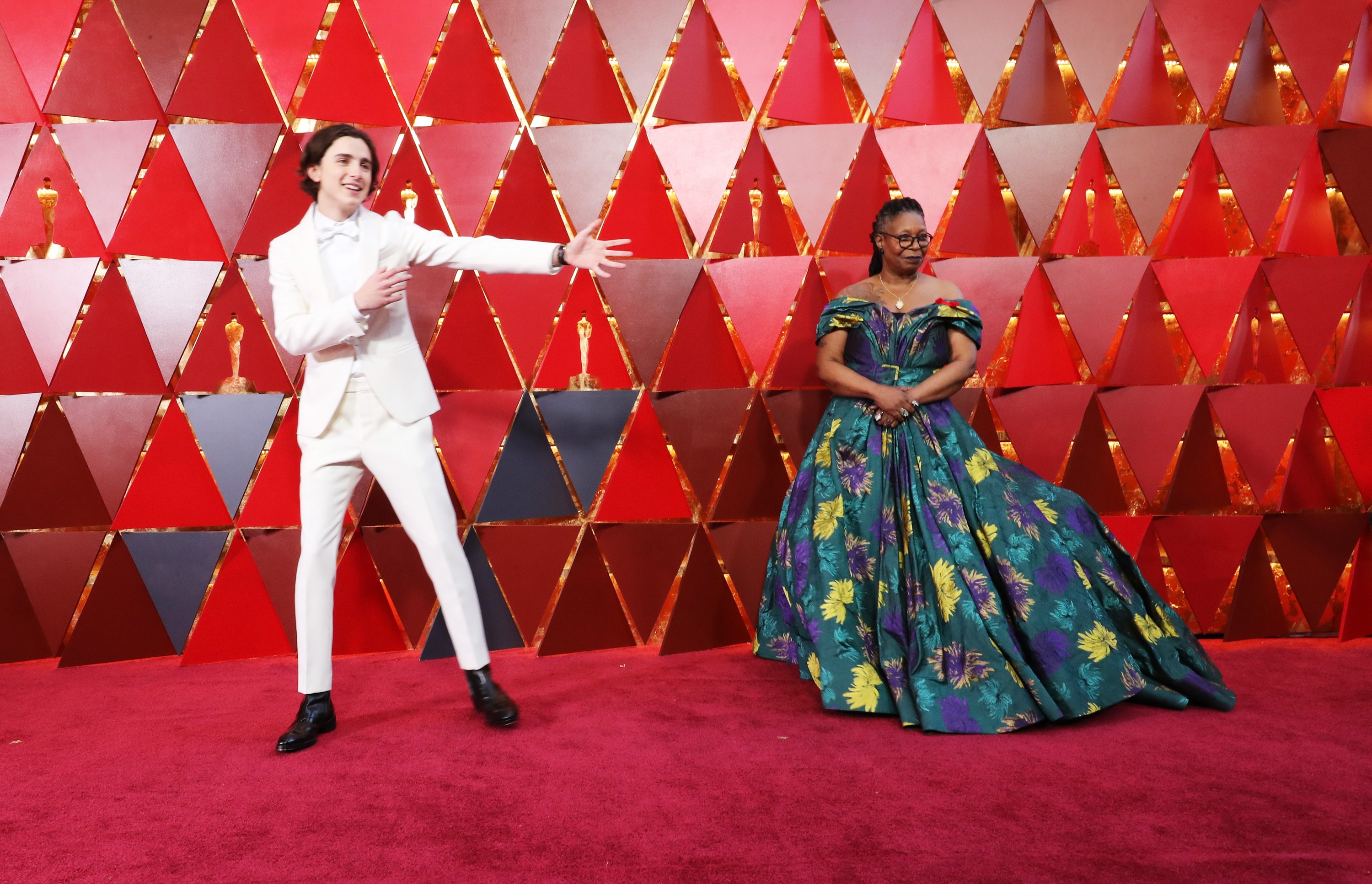 Et sandt generationsmøde på den røde løber. Den blot 22-årige Timothee Chalamet (tv) var nomineret til en Oscar for bedste mandlige hovedrolle for sin rolle i 'Call Me By Your Name'. Her er han foreviget sammen med 62-årige Whoopie Goldberg. (Foto: © Neilson Barnard, 2018 Getty Images)