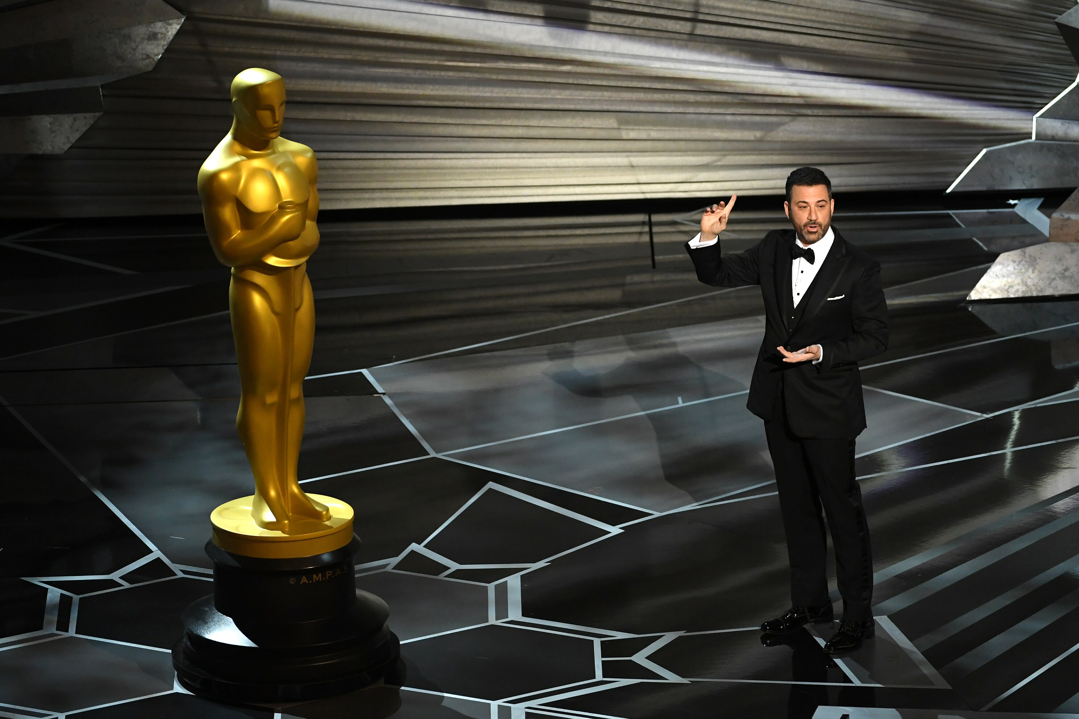 Oscar-værten Jimmy Kimmel på scenen sammen med en stor Oscar-statuette. Ifølge Kimmel er Oscar den perfekte mand, fordi han har hænderne, hvor man kan se dem, aldrig siger noget upassende og... ikke har en penis. (Foto: © Kevin Winter, 2018 Getty Images)