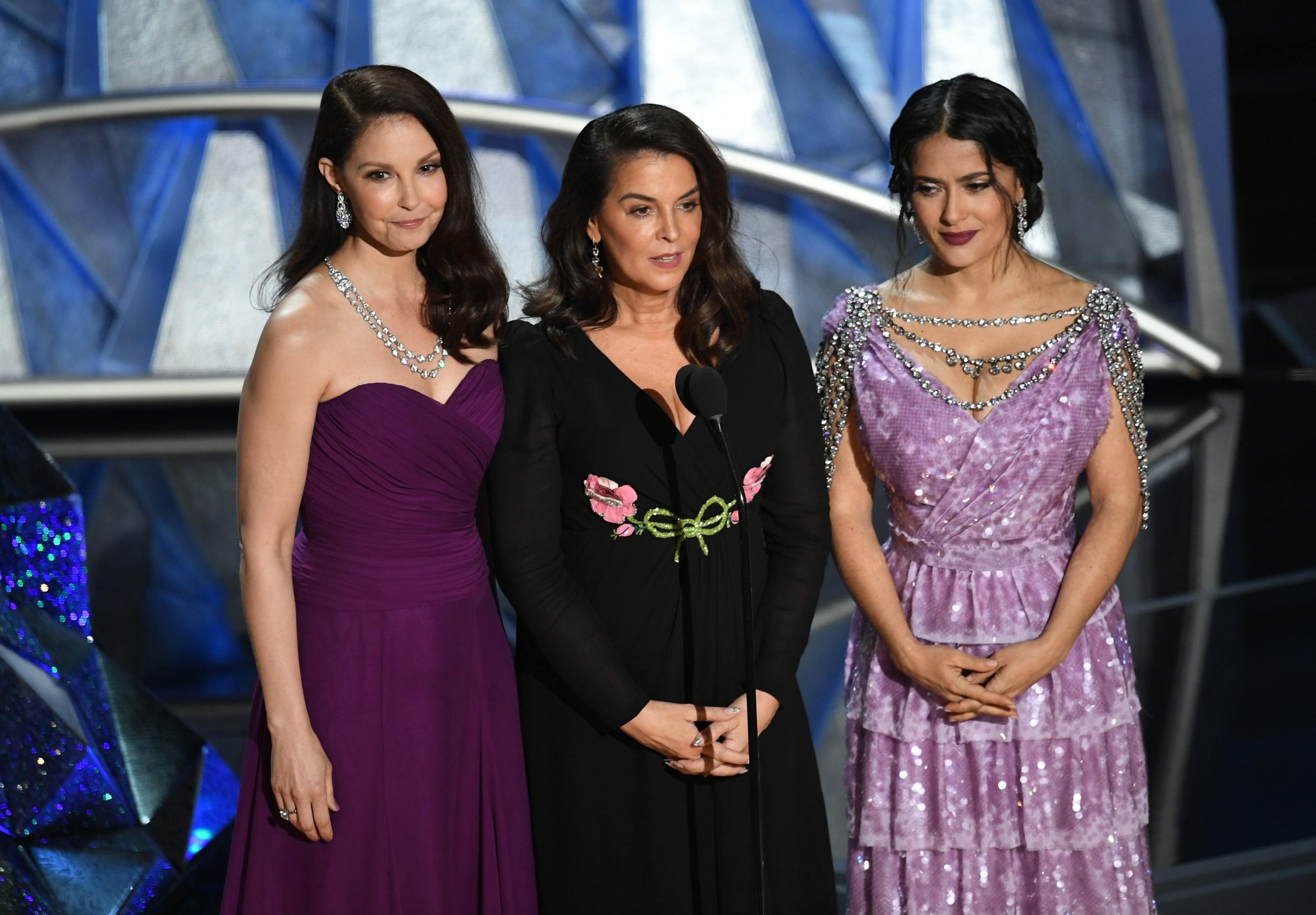 Selvom stjernerne ikke gik klædt i sort for at protestere mod sexchikane i filmbranchen ligesom ved årets Golden Globes, fik #MeToo- og #TimesUp-kampagnerne alligevel et par ord med på vejen. Her er det skuespillerne Ashley Judd, Annabella Sciorra og Salma Hayek, der taler bevæget om det sidste halve års kamp for ligestilling. (Foto: © Kevin Winter, 2018 Getty Images)