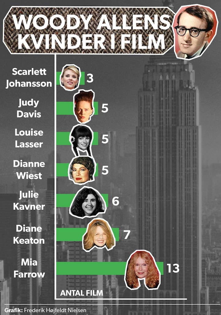 I dag runder den lille mand med den gigantiske filmkarriere 80 år. Og mens han er i gang med forberedelserne til sin biograffilm nummer 47 (!) fejrer vi ham her med en liste over de syv kvinder, der har været flest gange på lærredet i en Woody Allen-film