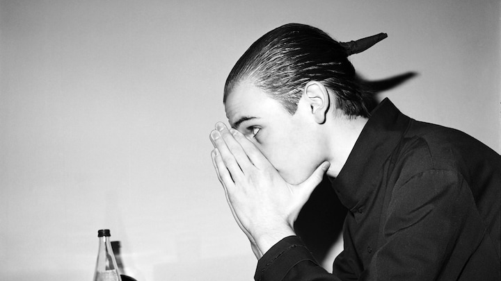 Ude fra vejen ligner han en voksfigur, som han sidder ubevægelig med ryggen til på en lyseblå polstret stol med guldkant og kigger skråt op til siden - ikke ned i en mobiltelefon. Hans hud er lys, hans brune hår er strøget nænsomt tilbage, skjorten er mørkeblå og med pressefolder, og over stolen ved siden af ham hænger en nålestribet jakke, der matcher de mørkeblå, nålestribede bukser.