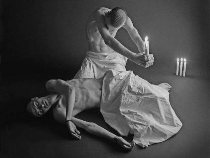 - Ud over at jeg og den anden hovedrolle skar os til blods og gav hinanden blowjobs på scenen, mens vi - indsmurte i svineolie og sminkede som lig - rodede rundt, så optrådte min far i rollen som nøgen Jesus, siger han.