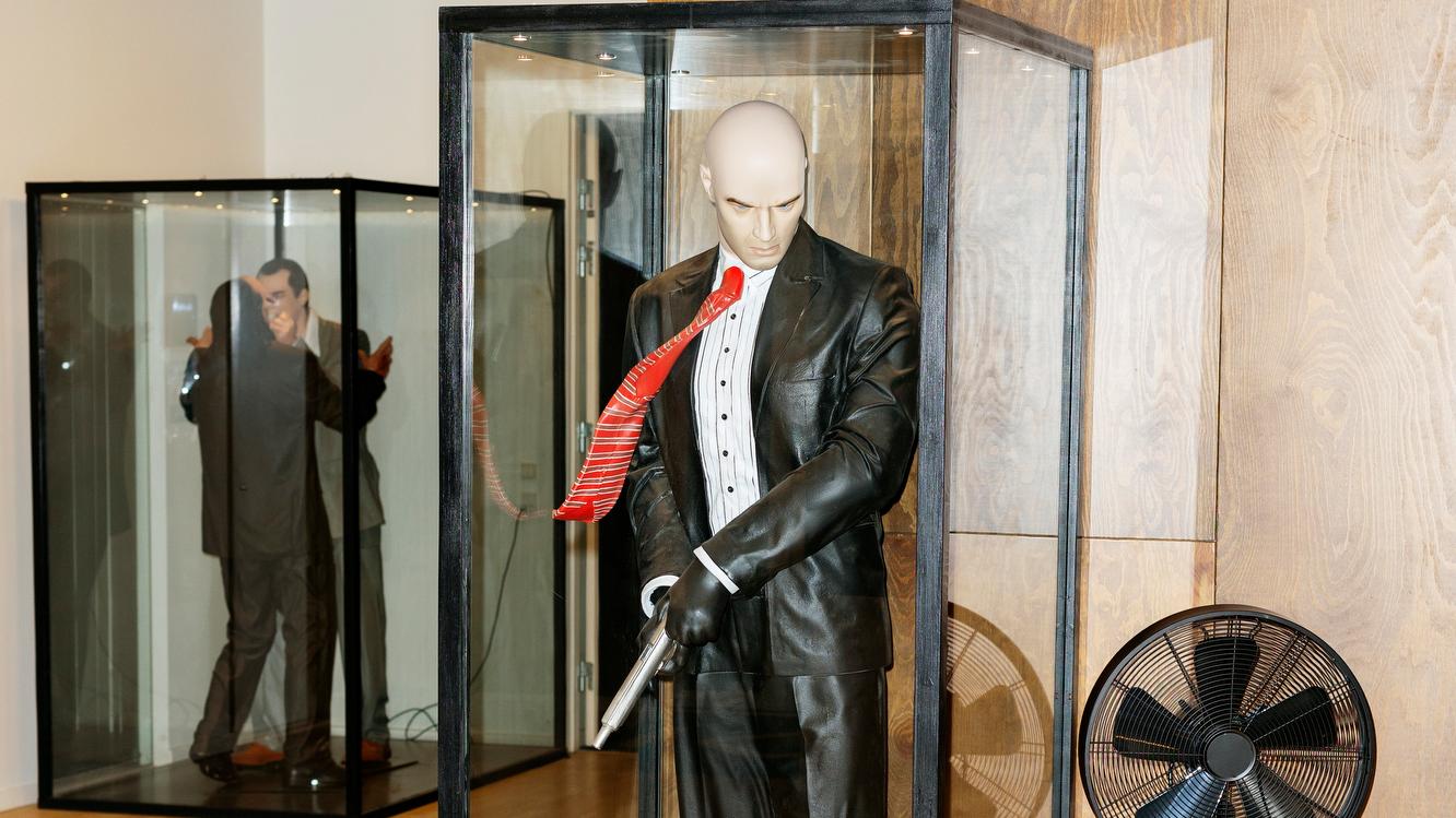 Her får man med det samme en Silicon Valley-vibe med farverige og moderne møbler, en bred, sort trappe med puder og en kæmpe voksfigur af manden, der er årsagen til, at IO Interactive kan betale sin helt sikkert høje husleje – nemlig agent 47 aka. Hitman.