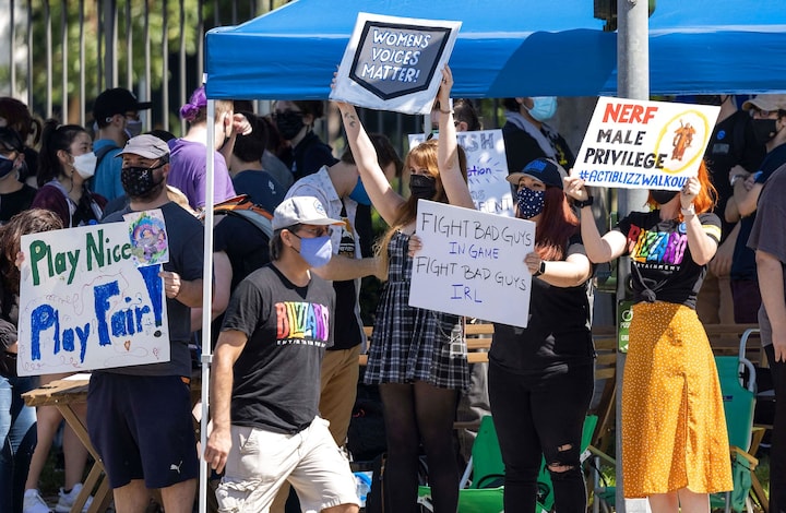 I stedet stod de foran bygningen, hvor Activision Blizzard har hovedsæde, med skilte hvor der blandt andet stod: "Send 'frat-drengene' tilbage i skole" og "kvinder i spilindustrien fortjener et sikkert sted at arbejde."