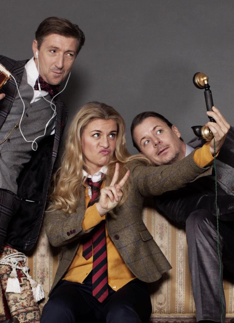 På det store banner, der hænger på Bellevue Teater står: ”det hele på halvanden time”. På billedet tager Mille Dinesen selfie af sig selv, Nicolaj Kopernikus og Anders W. Bertelsen med en gammeldags telefon.