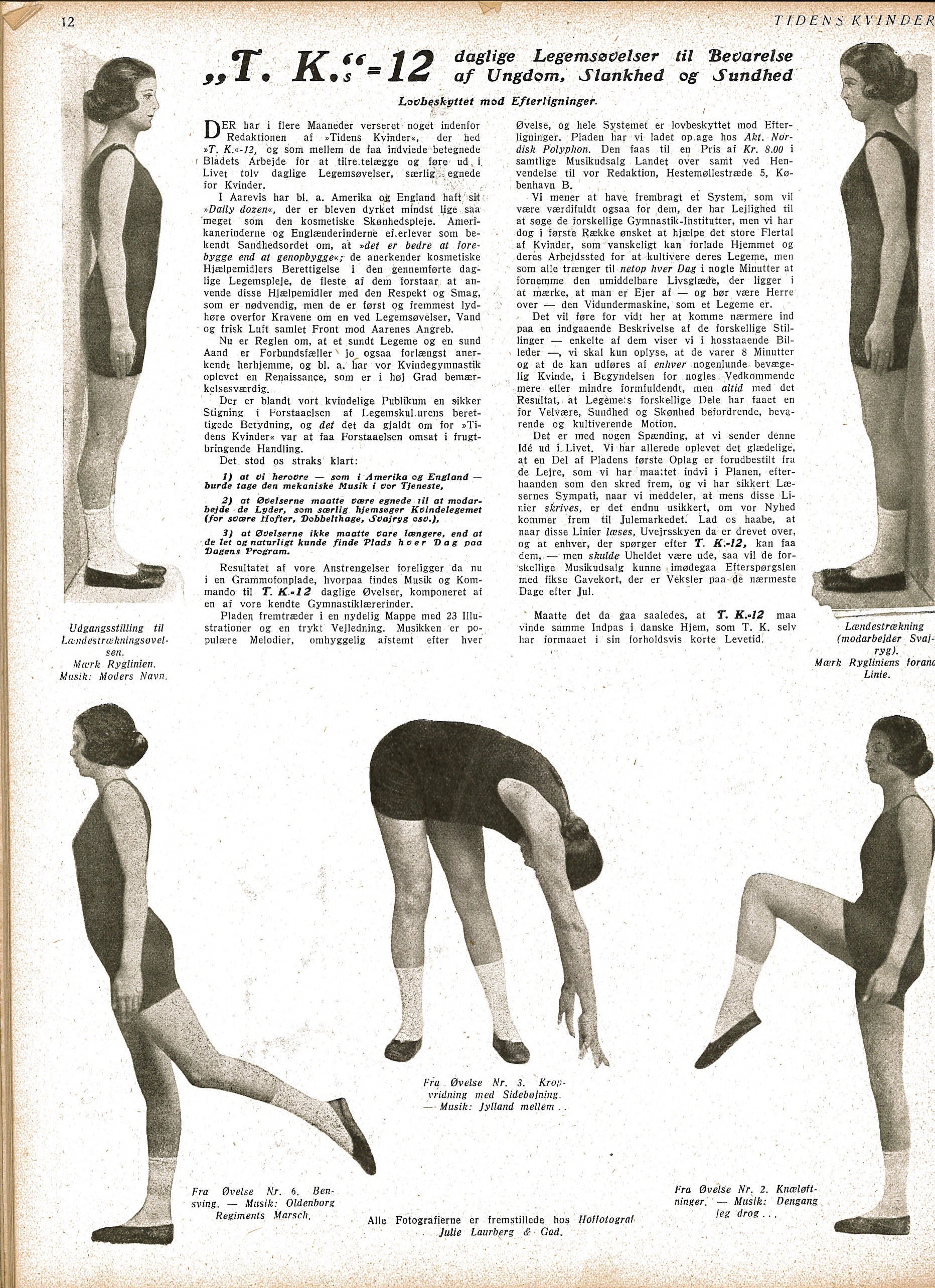 Gymnastik for kvinder var yderst populært i 1923, hvor denne artikel i Tidens Kvinder er fra. "I Aarevis har Amerika og England haft sit 'Daily Dozen', der er blevet dyrket mindst lige så meget som den kosmetiske Skønhedspleje," fortælles det om baggrunden for damebladets forslag til 12 daglige øvelser, som man kan lave derhjemme. Øvelserne skulle passe ind i kvinders travle liv. "...vi har dog i Første række ønsket at hjælpe det store Flertal af Kvinder, som vanskeligt kan forlade Hjemmet og deres Arbejdssted for at kultivere deres Legeme."