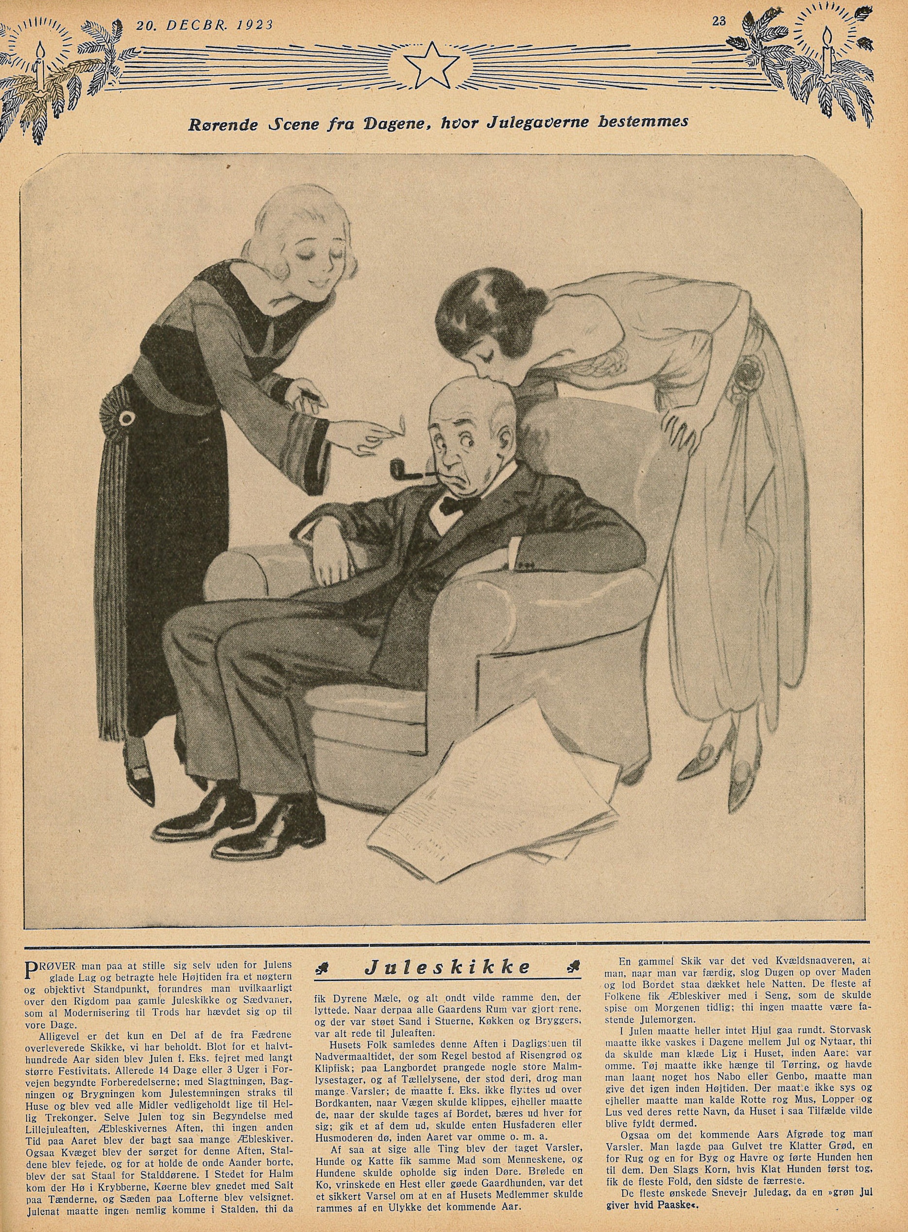 En satiretegning i Tidens Kvinder illustrerer tydeligt, hvem der typisk sad på pengene i 1923. "Rørende scene fra dagene, hvor Julegaverne bestemmes," lyder billedteksten.