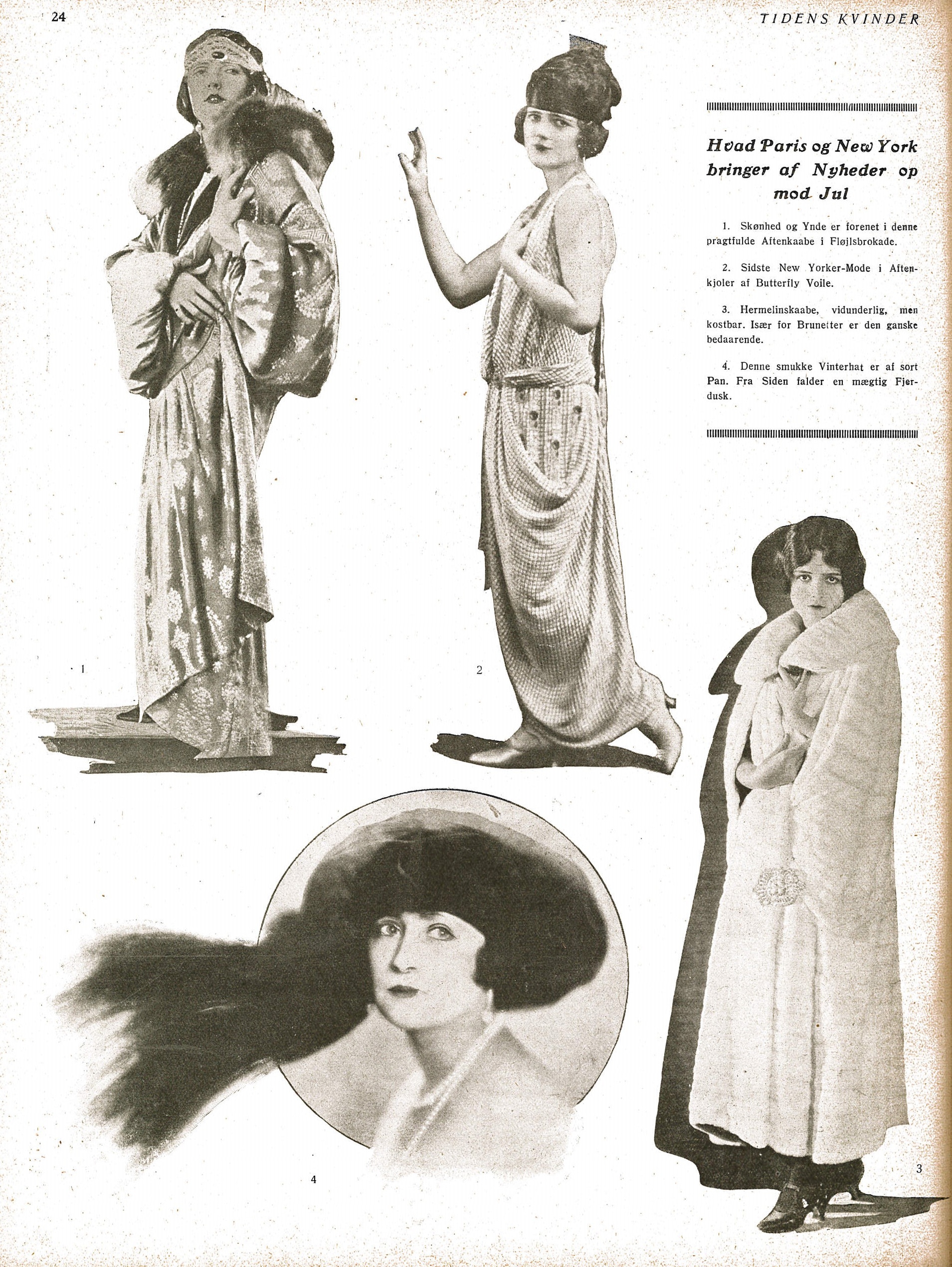 Modetendenserne kom i 20'erne især fra Paris og New York. Her er storbyernes juletendenser præsenteret. Blandt andet en hermelinskåbe, som er "...vidunderlig, men kostbar. Især for Brunetter er den ganske bedaarende." (Tidens Kvinder 1923)