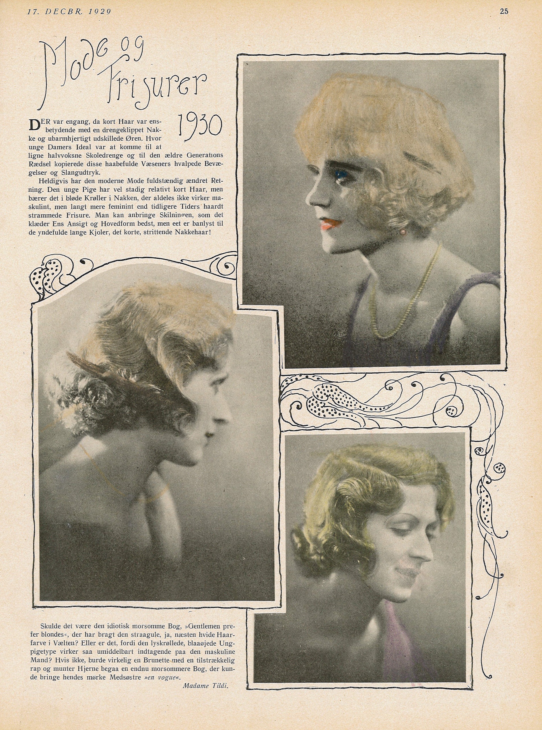 Modeeksperten Madame Tildi er i Tidens Kvinder fra 1929 glad for, at 1930's hårmode ikke længere er helt kort. "Der var engang, da kor Haar var ensbetydende med en drengeklippet Nakke og ubarnhjertigt udskillede Øren. Hvor unge Damers ideal var at komme til at ligne halvvoksne Skoledrenge og til den ældre Generations Rædsel kopierede disse haabefulde Væseners hvalpede Bevægelser og Slangudtryk. Heldigvis har den moderne Mode fuldstændig ændret Retning," lyder det lettet i artiklen. Madame Tidli har også en god idé om, hvor den nye blonde og kun halvkorte hårmode kommer fra: "Skulde det være den idiotisk morsomme Bog, 'Gentelmen prefer blondes', der har bragt den straagule ja næsten hvide Haarfarve i Vælten?"
