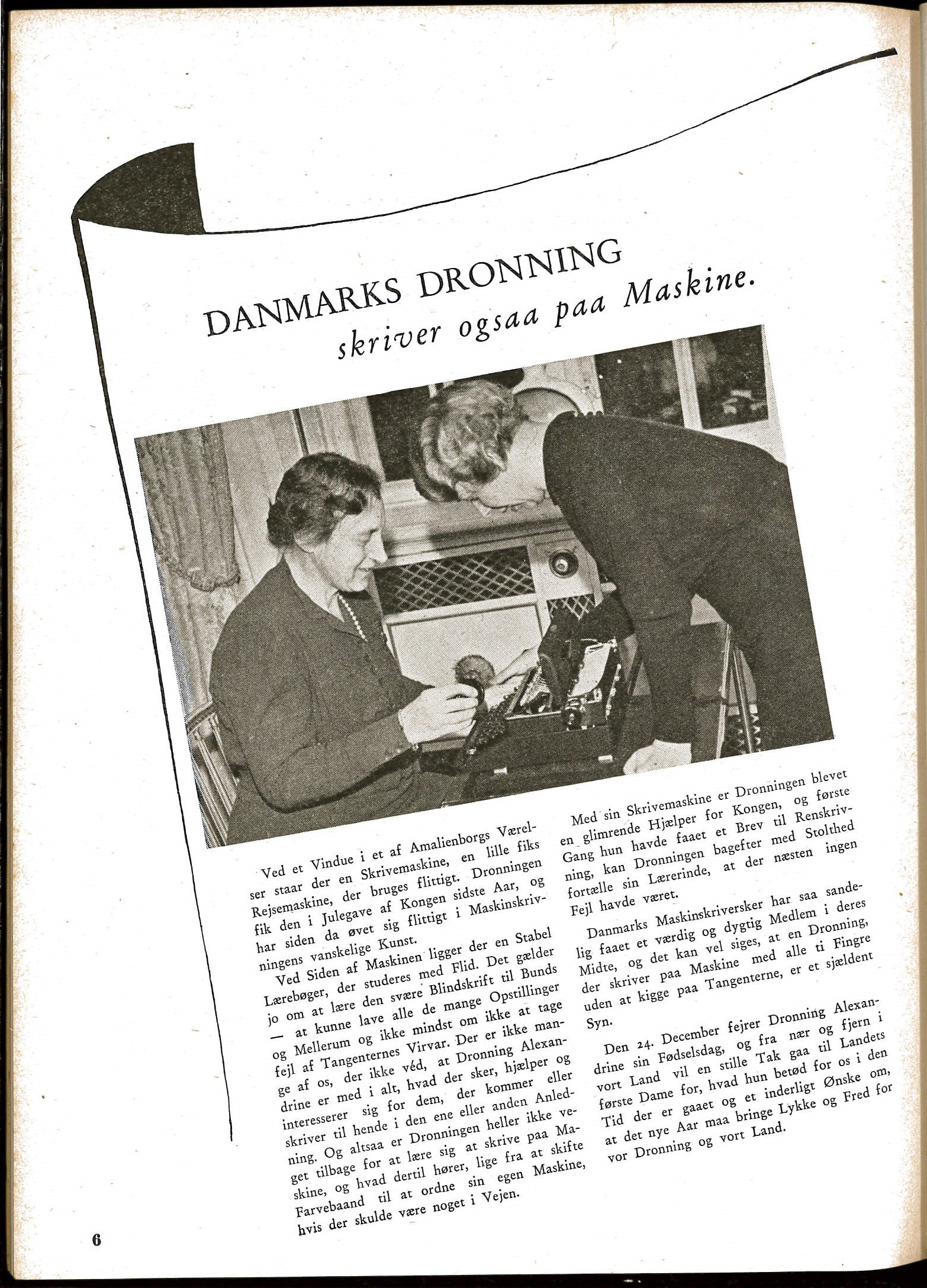 Kong Christian d. 10.'s hustru dronning Alexandrine havde fødselsdag den 24. december og var derfor et naturligt indslag i julenummeret af Flittige Hænder fra 1940. Her beskrives det, hvordan også dronningen er ved at blive ferm til at bruge den smarte nye skrivemaskine og 10-finger-systemet. "Med sin skrivemaskine er Dronningen blevet en glimrende hjælper for Kongen, og første Gang hun havde haft et brev til Renskrivning, kan Dronningen bagefter med stolthed fortælle sin lærerinde, at der næsten ingen Fejl havde været," lyder det i teksten.