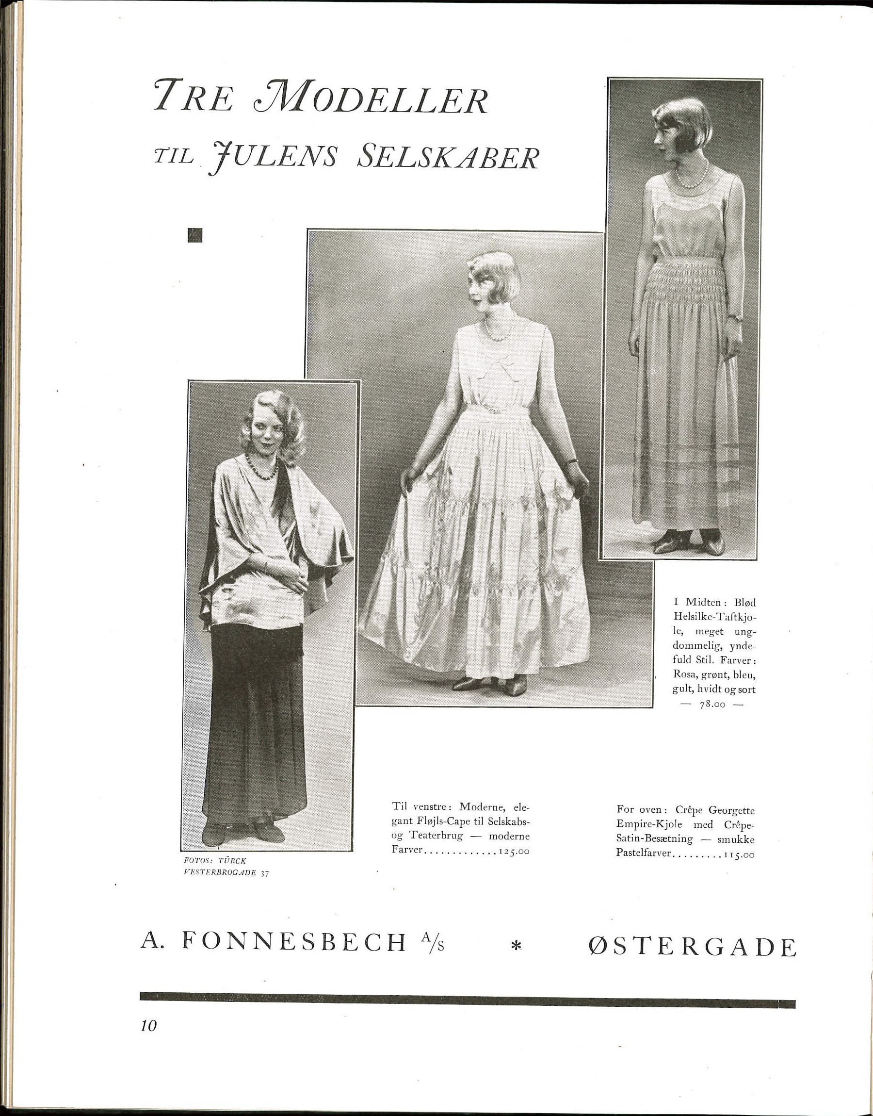 De såkaldte 'advertorials' - altså reklamer som ligner artikler - fandtes også i 1930. Her reklamerer 'A. Fonnesbech A/S' i Damernes Magasin for kjoler til julen.