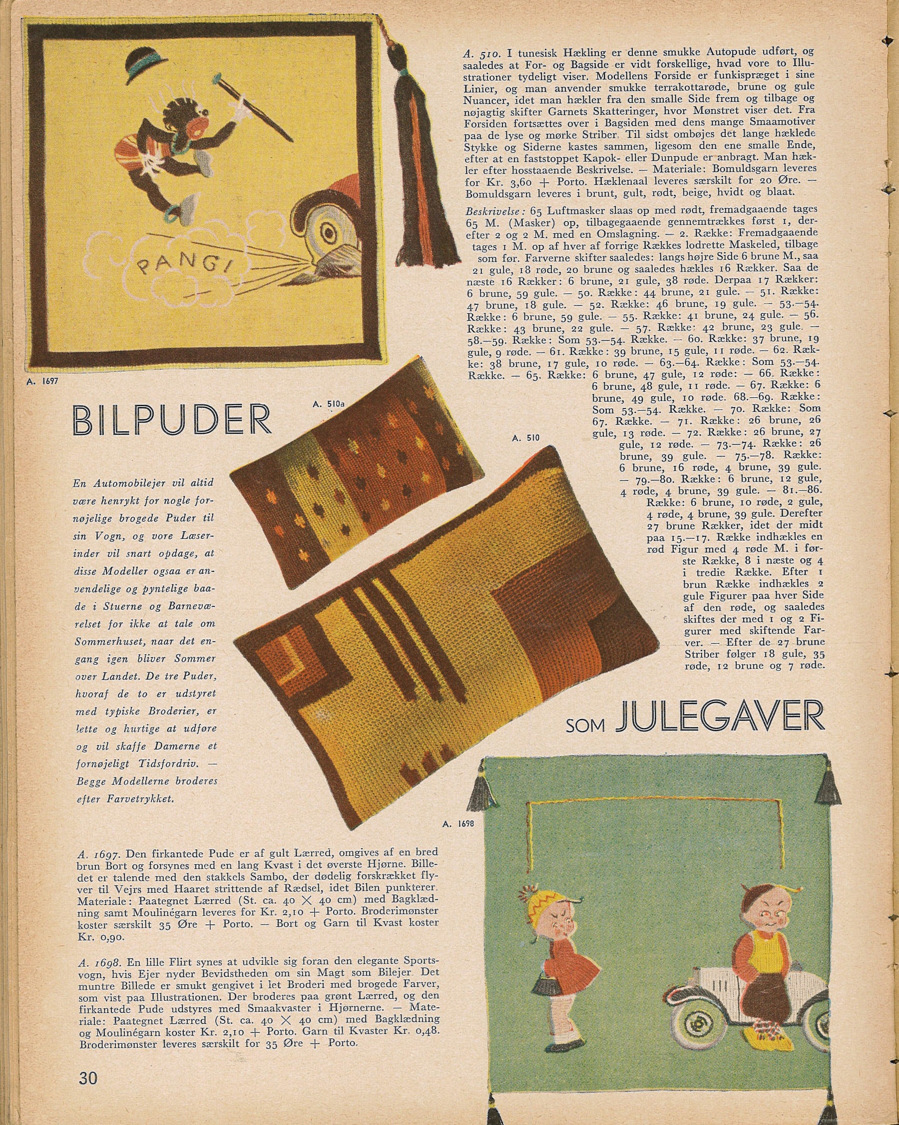 Nordisk Mønster Tidende fra 1935 foreslår at lave en pude til Automobilejeren med illustration af "Sambo" som bliver forskrækket, da et bildæk eksploderer. Hvordan mon den gave ville blive modtaget i dag?