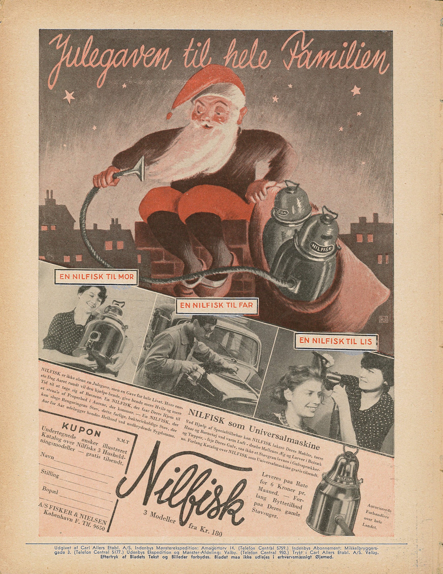 Nilfisk-reklamen i Nordisk Mønster Tidende fra 1935 stiller også kønrollerne skarpt op - og målretter sig i høj grad kvinderne. "Hver eneste dag Aaret rundt vil den hjælpe hende, give hende mere Hvile og mere Tid til at tage sig af Børnene," lyder salgsteksten. Kun en specialfunktion til sprøjtelakering af bilen - henvender sig til manden i huset.