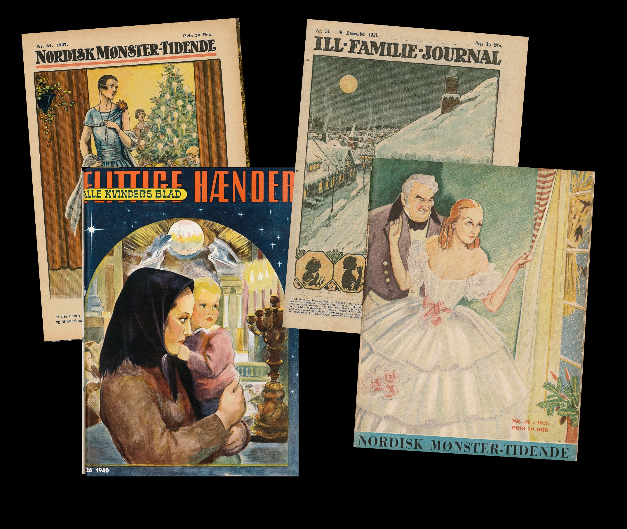Næsten alle damebladenes forsider var håndtegnede. Fra venstre er det Nordisk Mønster Tidende 1927, Flittige Hænder fra 1940, Illustreret Familie-Journal 1921 og bladet med den lumre ældre herre med den unge skønjomfru er Nordisk Mønster Tidende fra 1935.