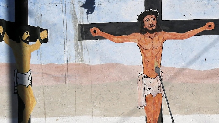 Musik med skyggetekst Haydn, som var stærkt troende katolik, fandt idéen god. Og den spanske opfordring fik ham til at skrive et af de mest originale værker fra hele den wienerklassiske periode: "De syv ord på korset". I sagens natur måtte det have syv satser, og allerede det var meget usædvanligt. Dertil supplerede Haydn med et dystert forspil og en afsluttende sats, der hedder "Jordskælvet", fordi der som bekendt udbrød jordskælv, da Jesus udåndede på korset. Hver af satserne er skrevet over en skyggetekst. Dvs. at de syv ord ikke bare fungerer som inspiration, men at tekstens rytme er brugt i musikken. Man kan simpelthen "synge med" på værket, hvis man følger den latinske tekst.