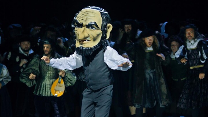 Sangeren Beckmesser er i Bayreuth en jødisk karikatur med et kæmpe hoved af papmaché, yamulka og slangekrøller og stor kroget næse.